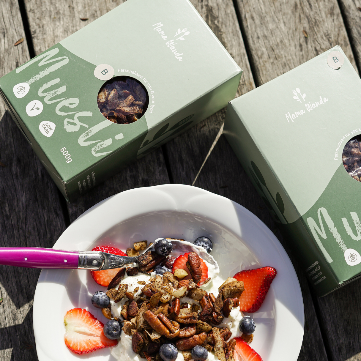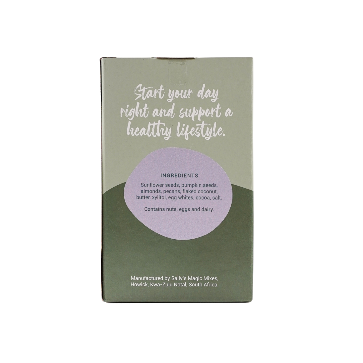 Sunflower seeds, pumpkin seeds, almonds, pecans, flaked coconut, butter, xylitol, egg whites, cocoa, salt.